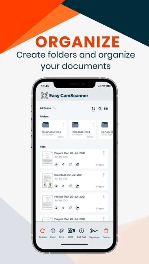 - Organize: Create folders and organize your documents.