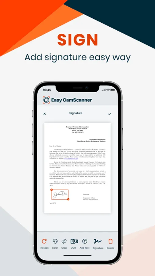 - Add signature in colour of your choice to any scanned document.