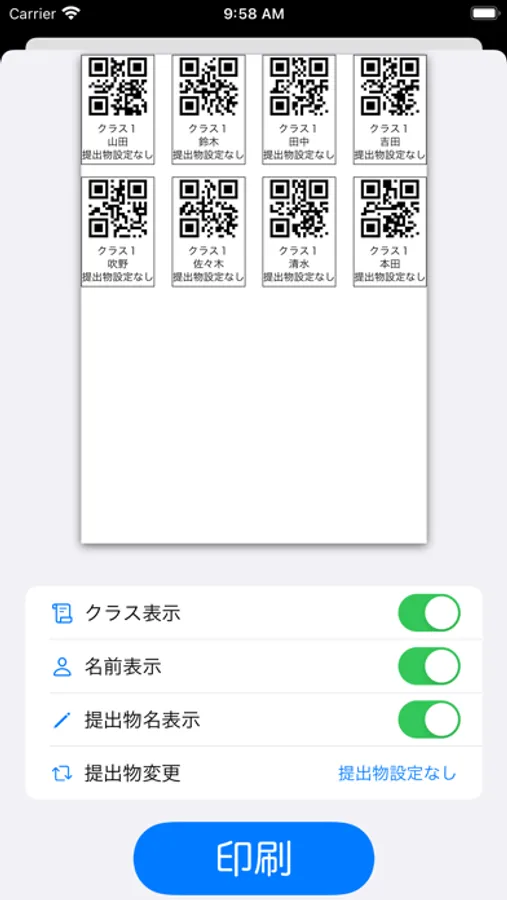 ①クラスの名簿と提出物の種類を登録したらQRコードを生成します。プリンターで印刷できるので印刷して生徒の提出物に貼り付けてください。