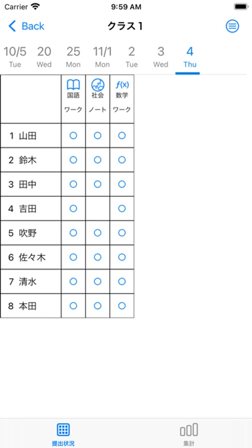 ③読み取ったデータは日付ごとに一覧表示できます。提出していない生徒もすぐにチェックすることができます。この提出結果は後から修正することも可能です。