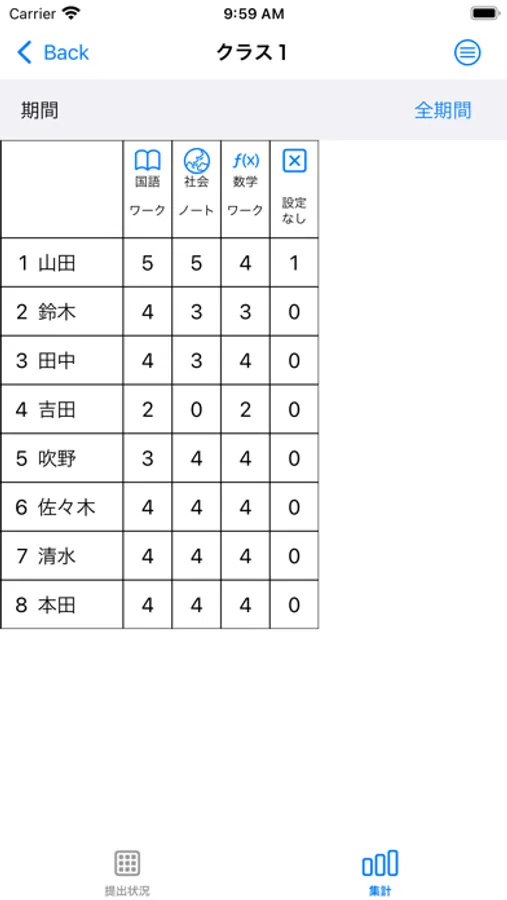④学期末には提出回数を集計して成績に反映する必要があります。集計も自動で行われるのでこの作業もぐっと楽になります。また、提出履歴をCSV出力する機能もあるので、PCに送信してエクセル等で集計することも可能です。