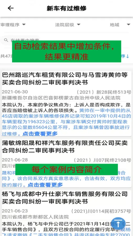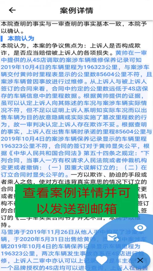 用AI技术精准检索类案,一键点击即可查看常见情况的最新相似案例,并可在相似案例的结果中进行更精细的个性化检索,对于具体的案例支持注册用户发送到邮箱进行学习。