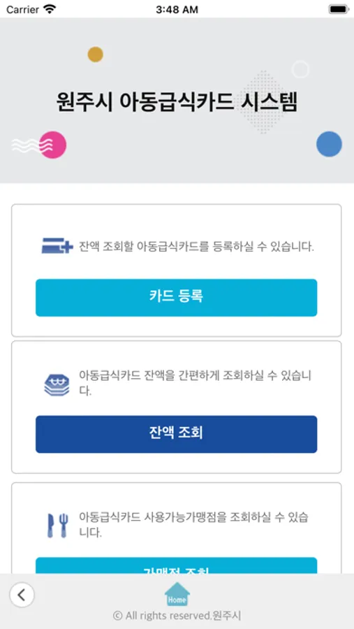 원주시 아동급식카드 이용자들을 위한 잔액조회 및 가맹점조회를 할 수있는 어플입니다.