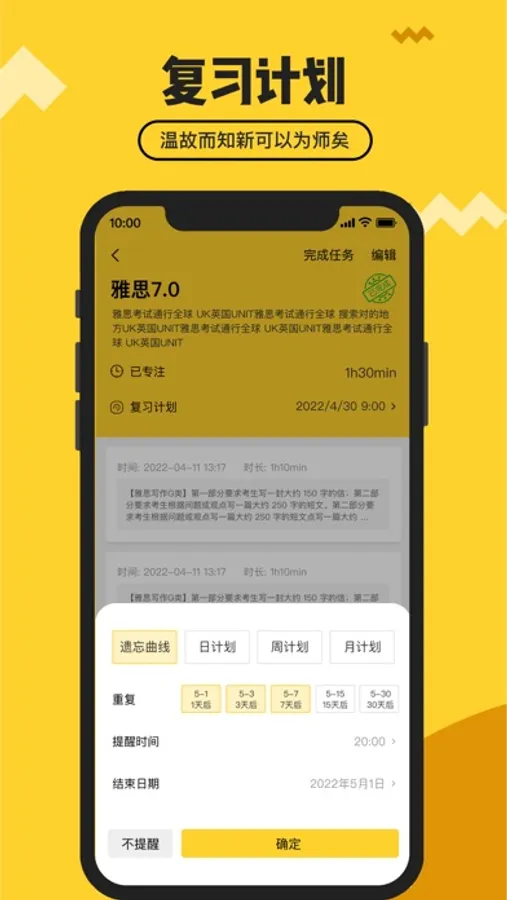 【复习计划】对学习任务设置复习计划,多种模式可选:遗忘曲线、每日、每周、每月重复计划,温故知新