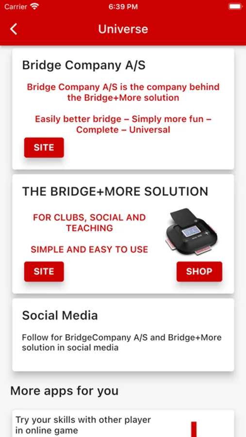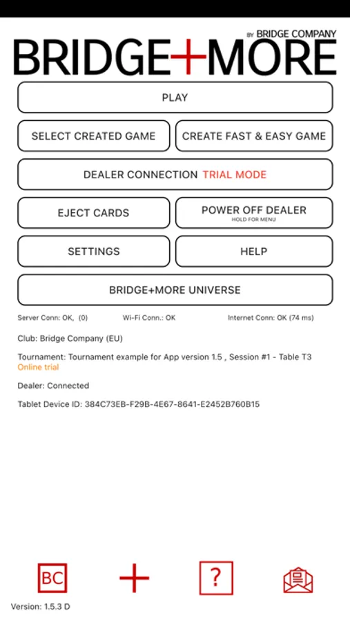 The Bridge+More solution is the most complete bridge solution and used in more than 40 countries already. The Bridge+More universe includes both the unique table card dealer/reader and the accompanying dealer app (this app) as well as apps for the players and the game administrator.
