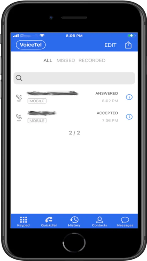 • Make and Receive calls from your VoiceTel number on your iOS device
