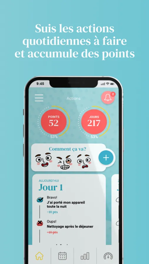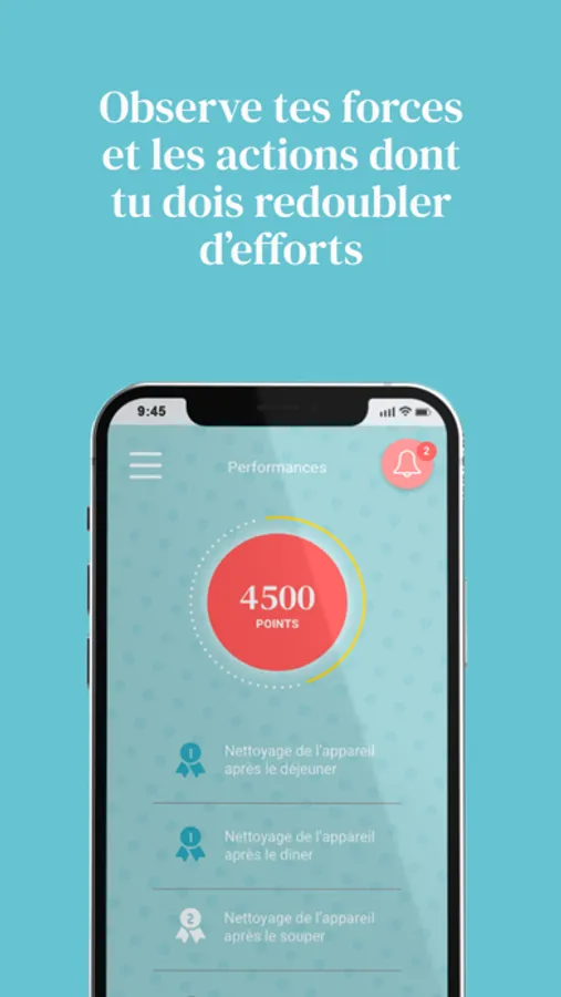 Sourire Parfait motive le patient en lui proposant d’accumuler des points chaque fois qu’il complète une action et lui montre l’évolution de son traitement :