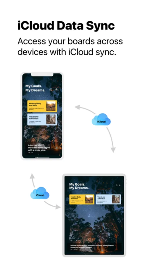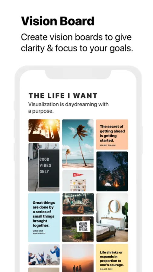 Create simple, beautiful vision boards in seconds. With an integrated search of Unsplash’s vast collection of photos, you can find inspiring photos quickly and easily. Add photos to your vision board with a simple tap. Add images from your own photo library or photos you find on the web. You can also create custom text entries that will appear alongside your photos. Add a favorite quote. Add an affirmation. Add anything you want. Make your board yours.