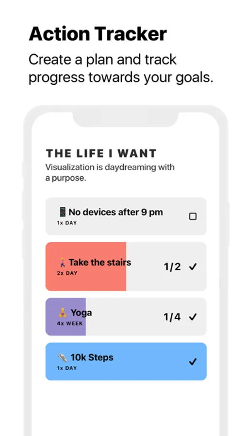 List actions you will take to get your closer to your goal. Horizons lets you create and track both tasks and actions that repeat daily, weekly, and monthly. See your actions and progress over time and feel motivated.