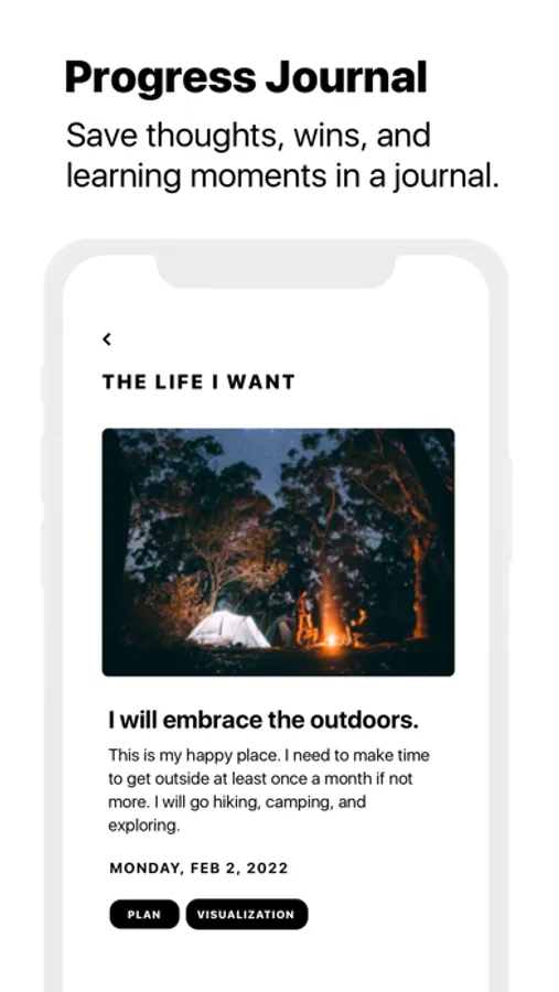 Save your experiences in Horizons. Each goal has its own journal. Save your thoughts, wins, learning moments, and photos. Reflect on your progress to learn and feel motivated.