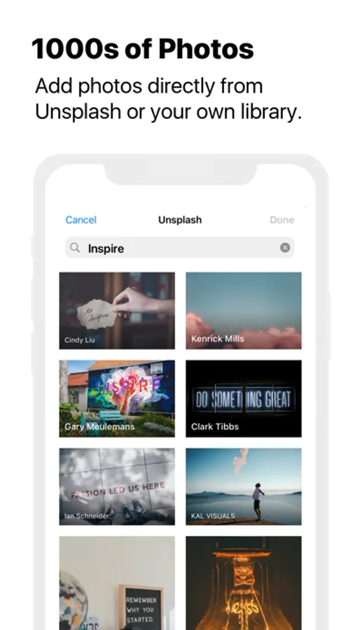 • Built-in access to Unsplash’s vast collection of photos