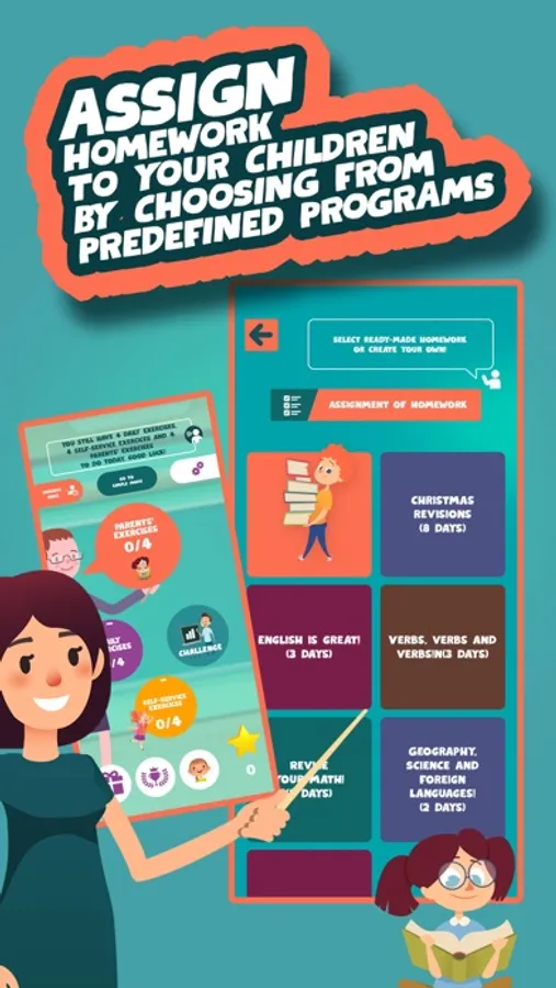 Thanks to the 'homework assignment' part you can assign specific exercises to your children so that they work on a particular point of the program. Ready-made homework is also available, these homework takes place over several days (4 exercises per day to do) and makes the children work on specific points or tackle various subjects to revise during the holidays for example.