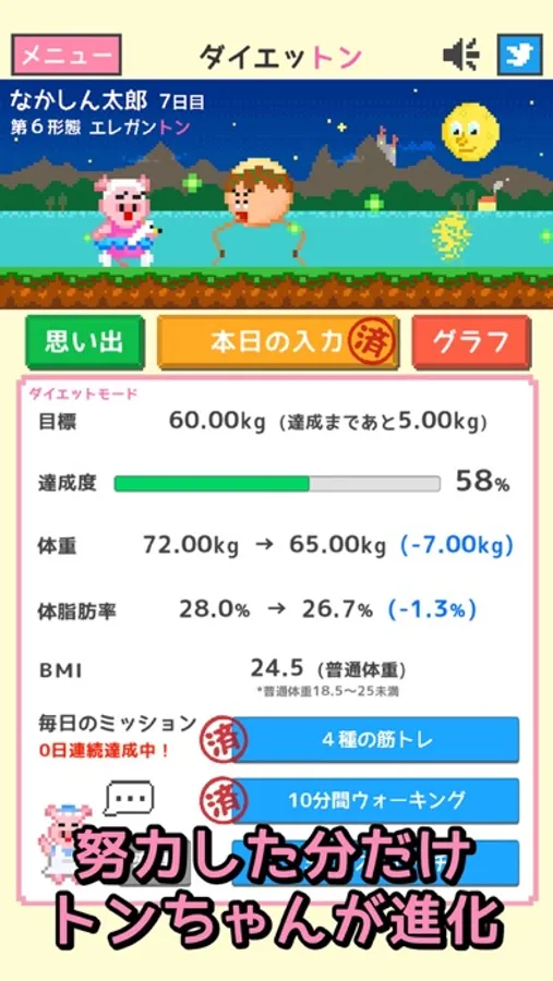目標の数値に近づくごとに子ブタのキャラクターが進化していきます。習慣から変えて、健康的な減量を目的とします。トンちゃんを襲ってくるカロリーモンスターを倒して、いろんな誘惑に打ち勝とう!