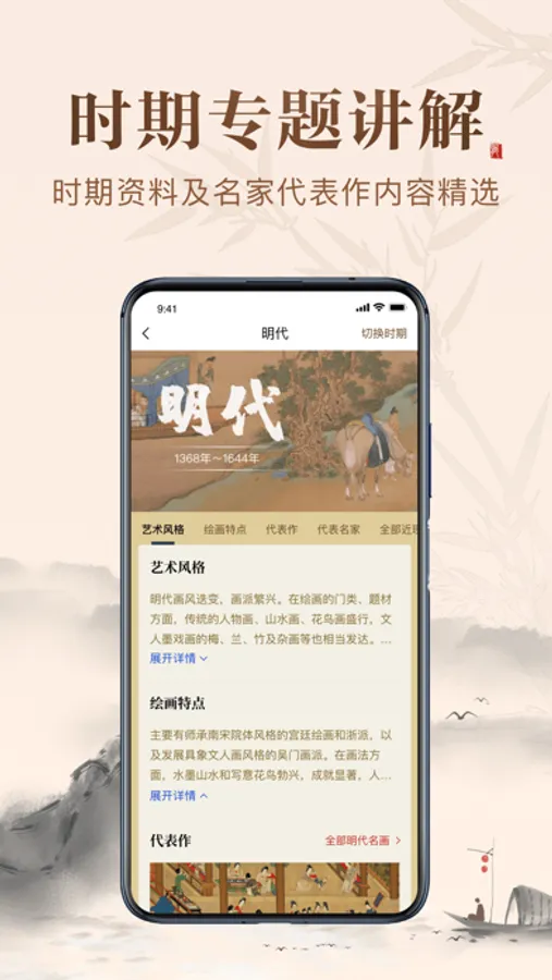 历代名画集APP是一款面向喜爱中国传统文化,对中国绘画和书法感兴趣的APP。精选收录了从晋朝到近现代的书画名家经典传世作品。图片高清真实,色彩准确、绢丝可见,作品分类清晰。作品解析详尽可充分感受深厚的文化底蕴。设置名家专题,赏析名家画作的同时,了解画作背后的故事,画家的绘画风格和生平历程。