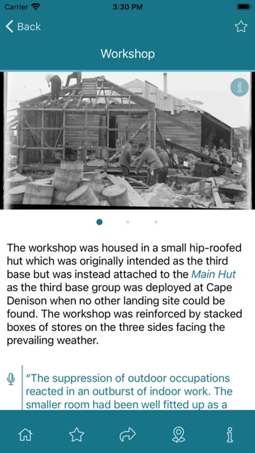 The Mawson's Hut Foundation Interpretive App is a Virtual Tour Guide for visitors at the Replica Hut of the Mawson's Hut Foundation located in Hobart, Tasmania or at the original Mawson's Hut located in Cape Denison, Commonwealth Bay (Australian Antarctic Territory).