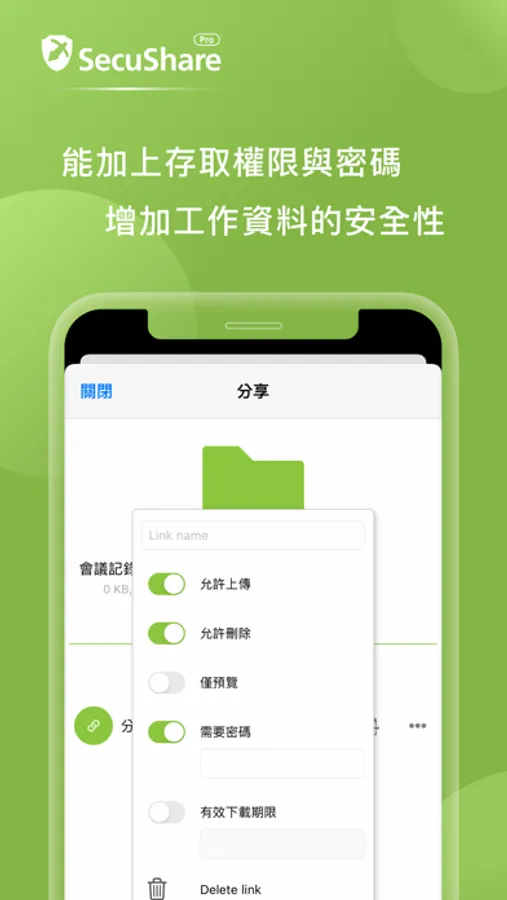 • 分享:透過安全的系統內部帳戶控管來分享檔案或資料夾以及使用外部連結密碼設定機制,輕鬆與同事、客戶、合作夥伴分享檔案或資料夾。