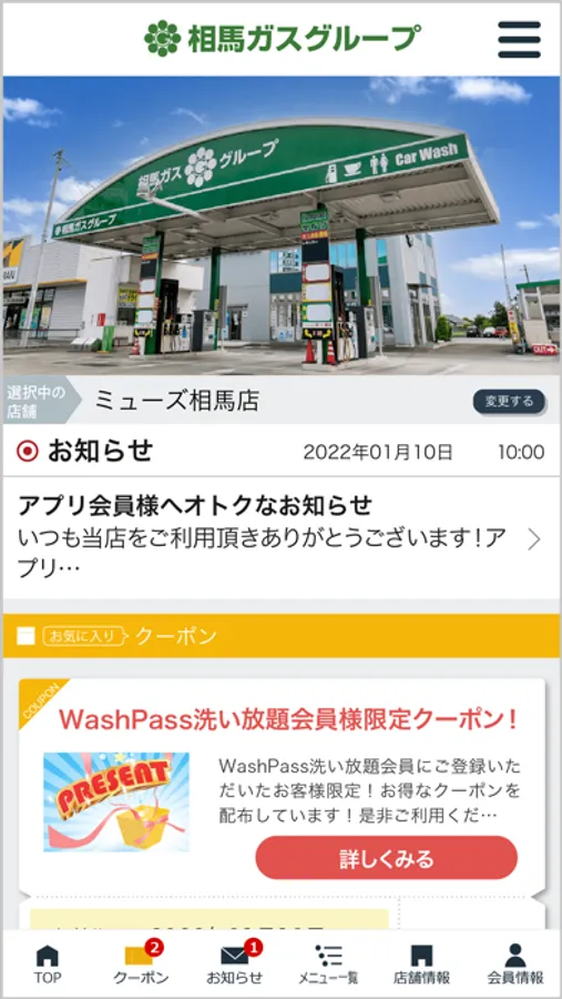 当社のアプリ「相馬ガス会員アプリ」ではWashPass(セルフ洗車機 洗い放題会員)のお申し込み・お支払い・ご利用いただけます。またアプリにて当店で利用いただけるお得なクーポンや各種メニューの割引情報を配信しております。