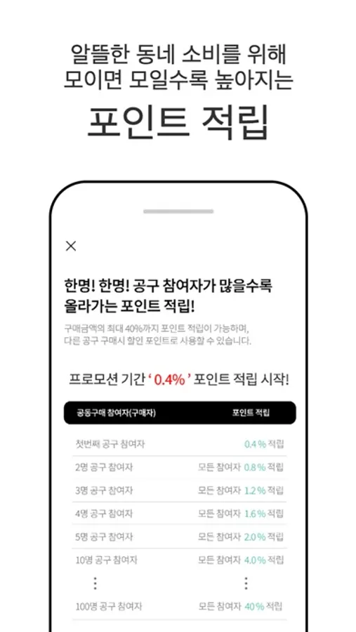 공동구매 참여자가 많아질수록 적립률이 높아지는 새로운 포인트 적립 방식으로, 적립된 포인트는 나중에 상품 구매시 할인 혜택을 받을 수 있습니다.