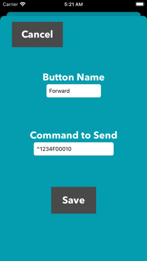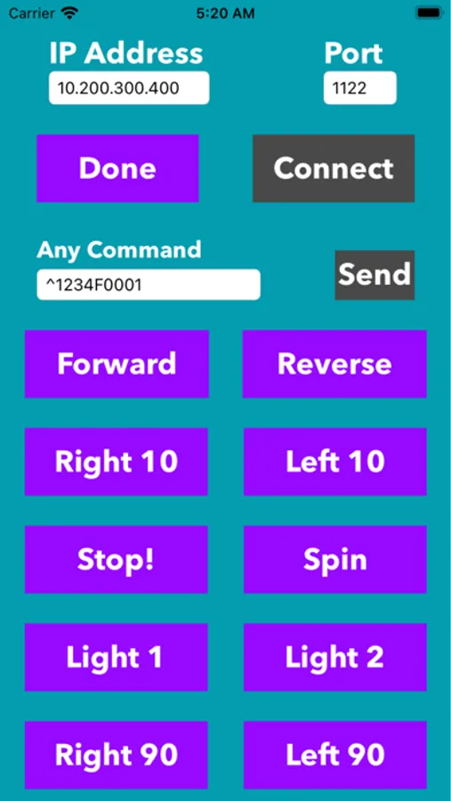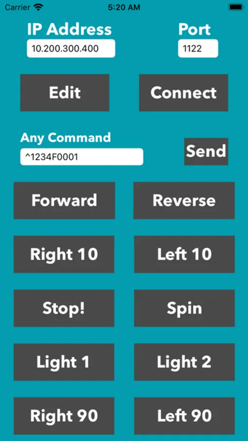 This app allows you to send custom commands via a TCP connection. You input the IP address and port number for the TCP connection you would like to create, and then you can customize the ten buttons to have ten saved commands. The “Any Command” text field can send any message that is typed into the text field. A carriage return and linefeed are appended to all messages.