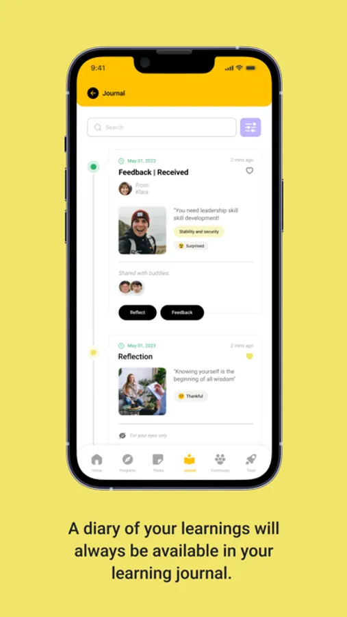 Here all your activities and lessons are saved. Your reflections, the feedback you have received and given others and much more that you can follow over time. A diary of your learning simply where you can follow and evaluate your own development.