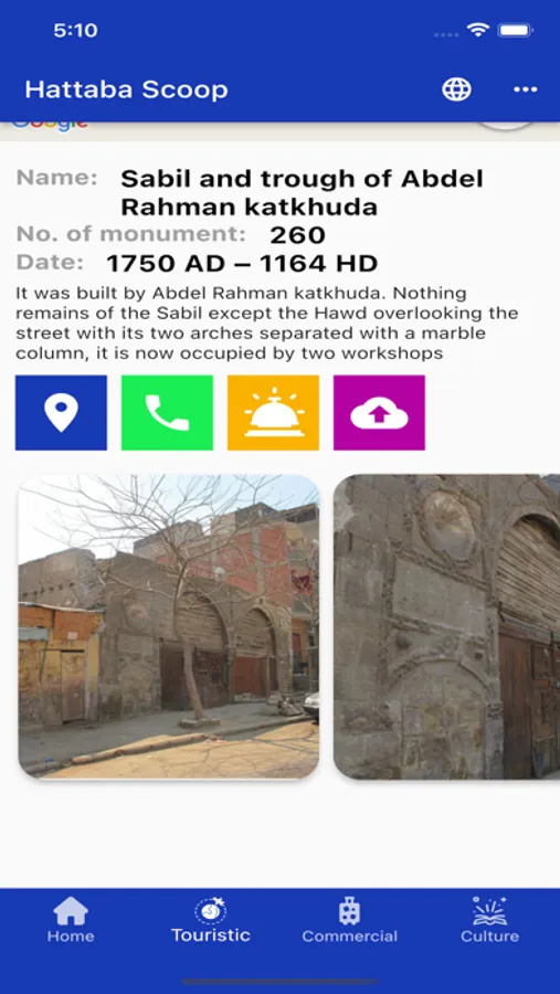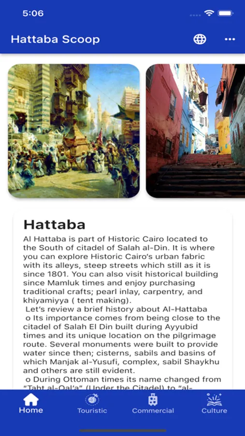 Hattaba scoop is an experimental app for research purposes that enables users to explore the monuments, access the crafts shops virtually, and enrich their cultural knowledge of the historic site of Al Hattaba as a part of Historic Cairo in Egypt. It can be downloaded to mobile devices such as smartphones and tablets. The goal is to give visitors to Historic Cairo in Egypt an immersive experience that goes beyond simply reading guidebooks and visiting historic sites.
