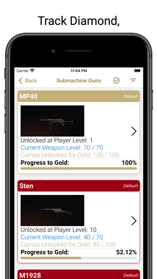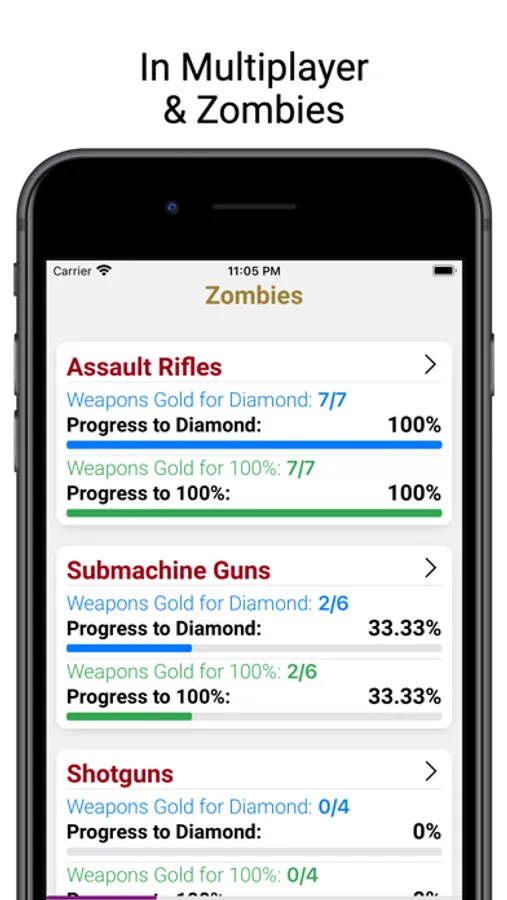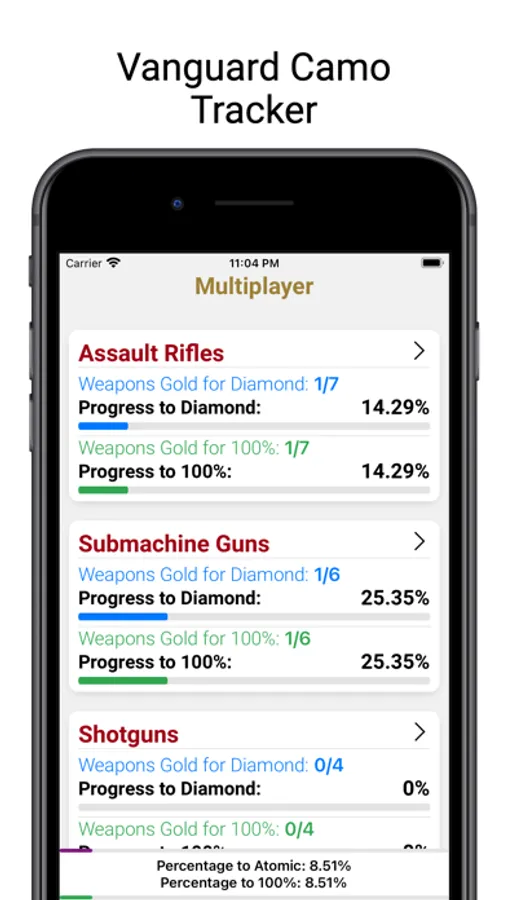 With Vanguard Zombies and Multiplayer options, you can track each weapon, with progress tracking for Dark Aether/Atomic, Diamond/Plague Diamond, Gold, and Golden Viper Camos.