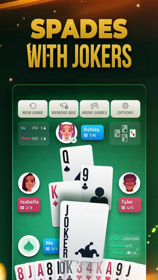 Our offline Spades free game app is suitable for both beginners and professionals. Play anywhere, and learn how to outfox your opponents!