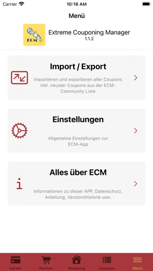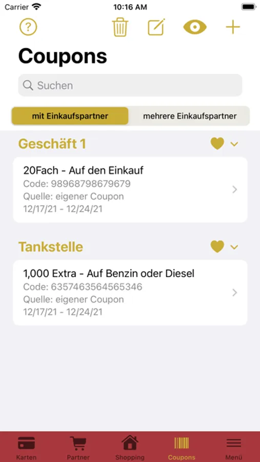 Nachdem du einmalig deine Couponpartner (die Geschäfte, in denen du die Coupons verwenden möchtest) angelegt hast, kannst du auch schon beginnen die Coupons zu hinterlegen. Diese werden dann sortiert nach Partner, Wert, Ablaufdatum inkl. Barcode hinterlegt. Diese Eingabe erfolgt entweder per Eingabe des EAN-Codes oder über deine Kamera, aber auch über die Importfunktion (siehe unten)