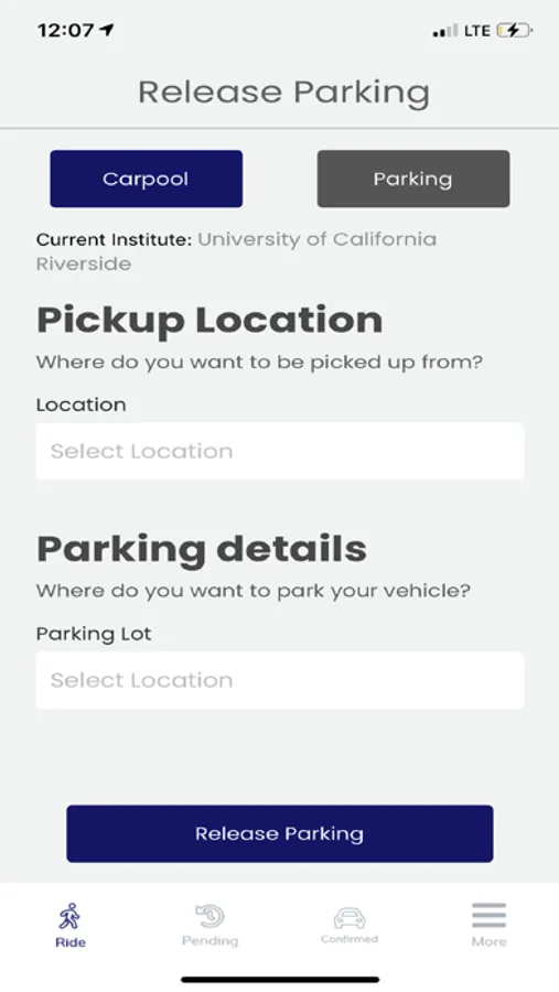 Pickup N' Park is a platform to help connect university students looking for parking or carpooling within their campus. Students leaving campus can get a ride back to their car by booking rides through the parking feature of the app. Students coming to campus can share a ride with other students on their way using the carpool feature of the app.