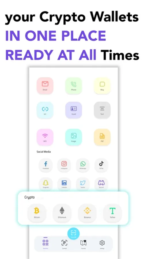 - Share complicated Crypto Wallets with an easy Qr code scran, Bitcoin, Ethereum, Binance, Tether .. more coming soon