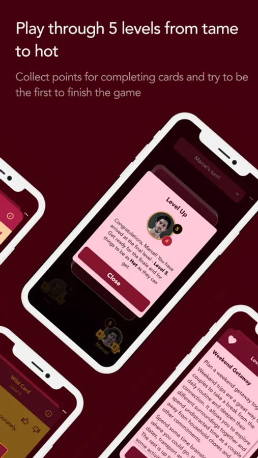 Start off tame with level 1 and work your way to the hottest level - level 5. You will be wearing less clothes, answering spicier questions and completing naughtier tasks as you progress through the levels. Collect points for completing cards, try to beat your partner to the win and select a special fantasy card to finish off the game.