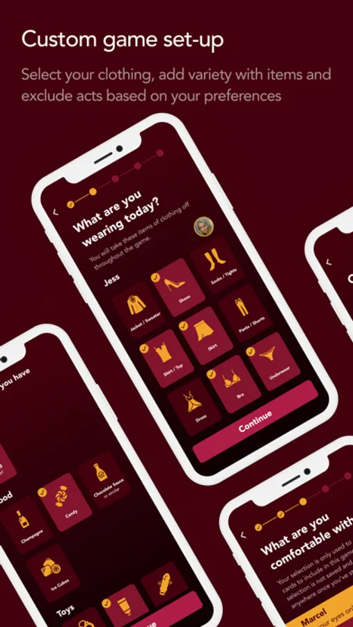 * Custom game set-up: select your clothing, add variety with items and exclude acts based on your preferences