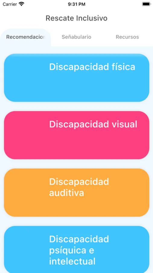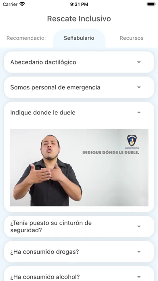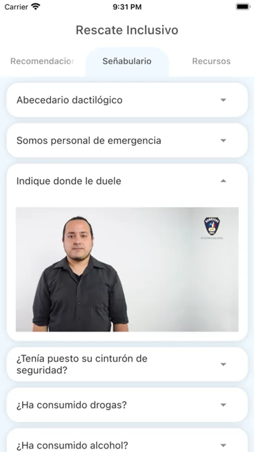 Aplicación móvil para primeros respondedores en rescate inclusivo. Un apoyo para los primeros respondedores como Bomberos, Carabineros, SAMU, Policía de Investigaciones, ONG, miembros de la comunidad, entre otros. Es un manual de campo de forma tal, que es una caja de herramientas portátil que entrega recomendaciones, señabulario (Lengua de Señas Chilena) y algunas herramientas de bajo costo para ir en ayuda ante la necesidad de atención de personas con distintas discapacidades en situaciones de emergencia o evacuación. Esta aplicación será gratuita y de libre descarga. Esta aplicación ha sido diseñada por la academia nacional de bomberos y senadis.
