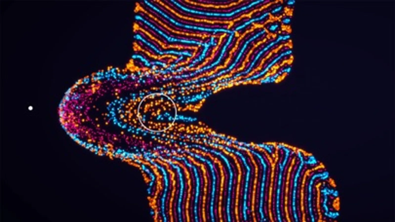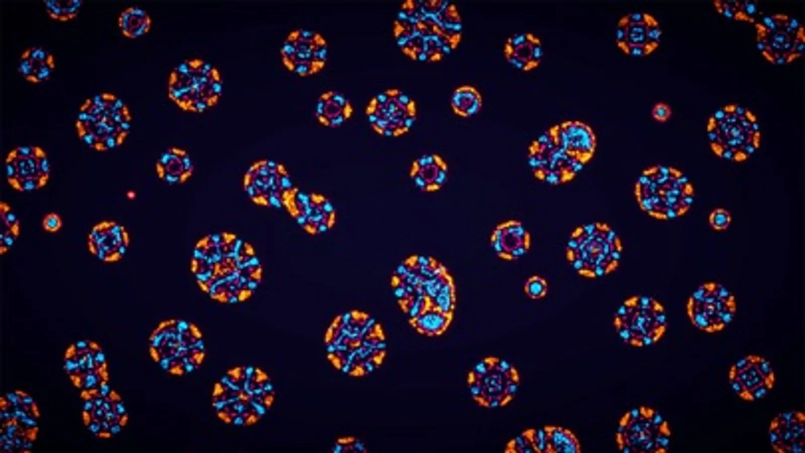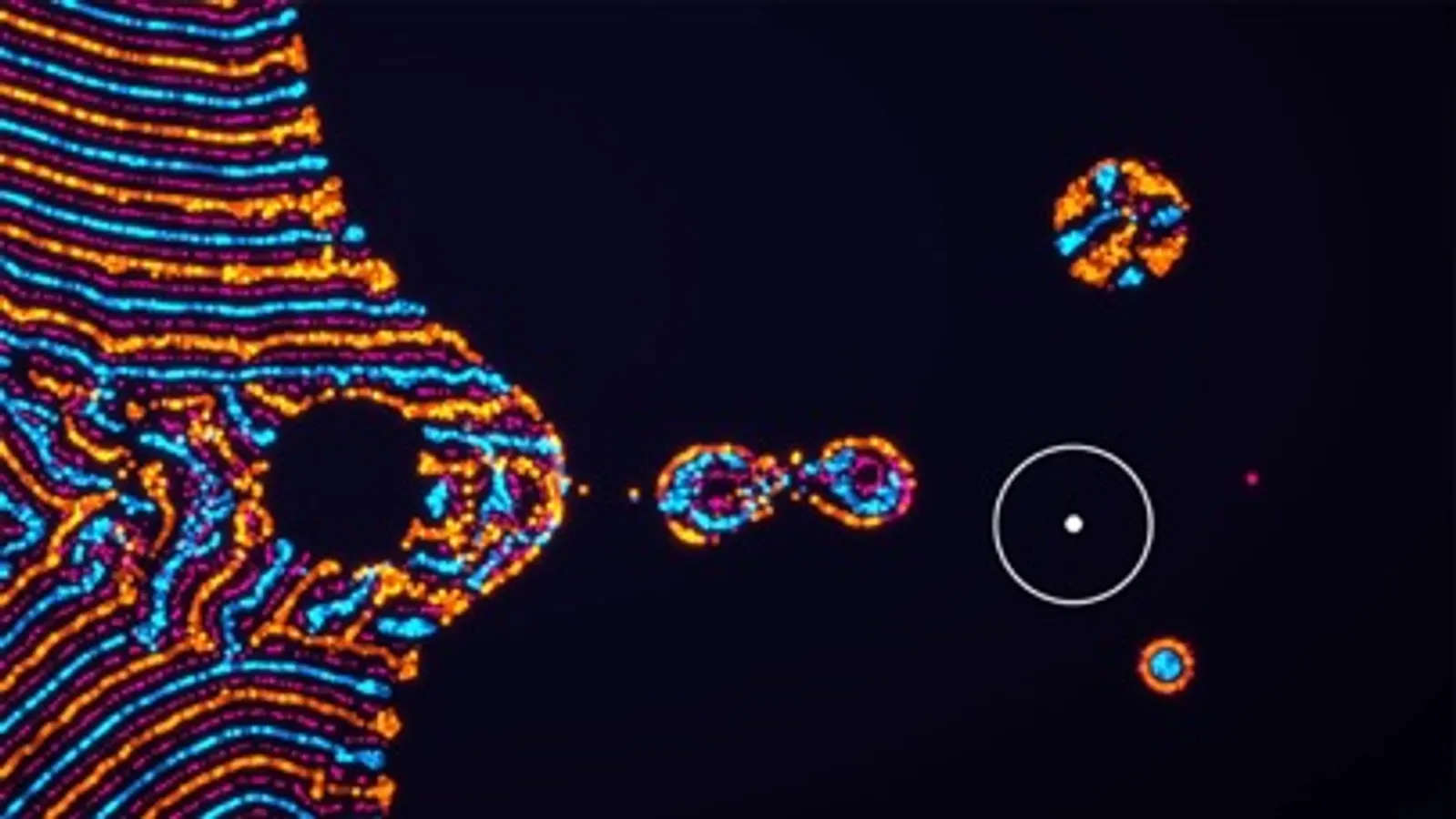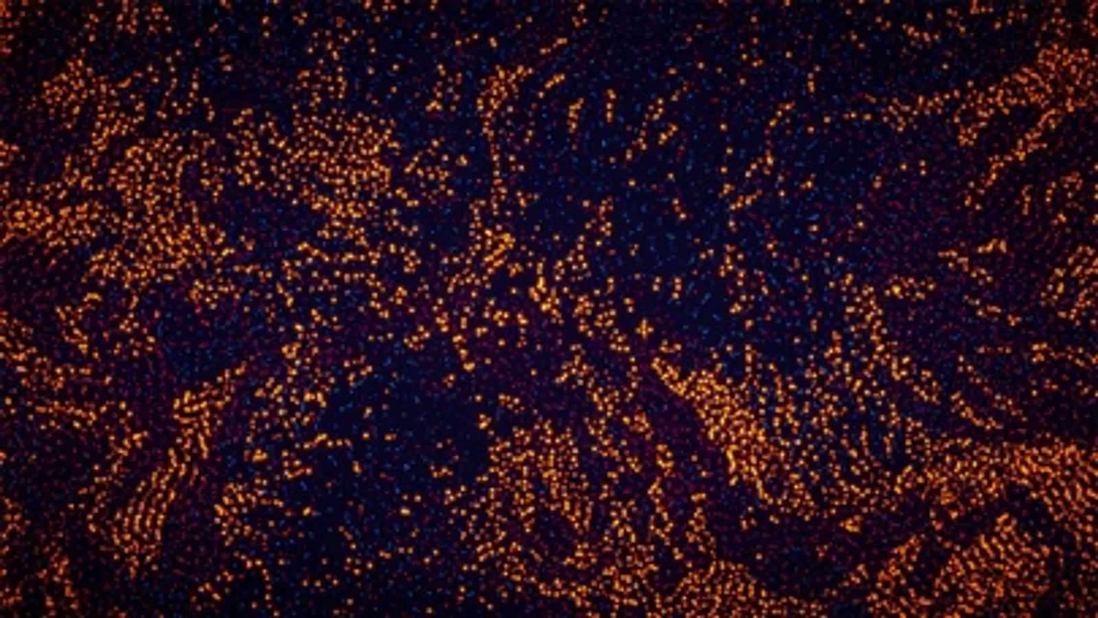 In this work, more than 15k particles of three types wander around the screen, each controlled by eight different parameters, together forming a complex and interesting bionic system.