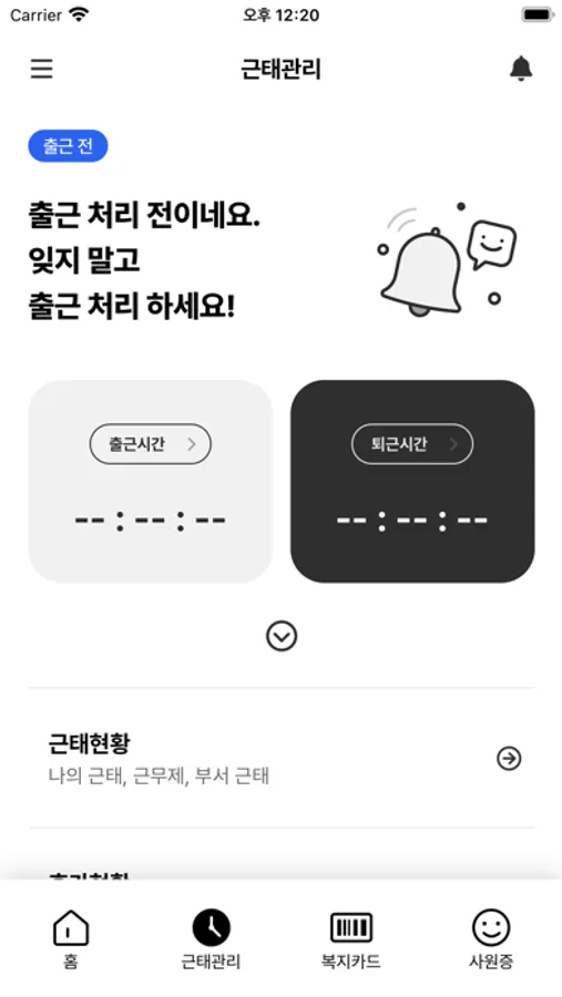 오늘의 출퇴근 및 이번 주 근태내역은 물론, 주 52시간을 계획적으로 관리하기 위해 기업의 근무 정책에 맞는 효율적인 관리 기능을 제공합니다.
