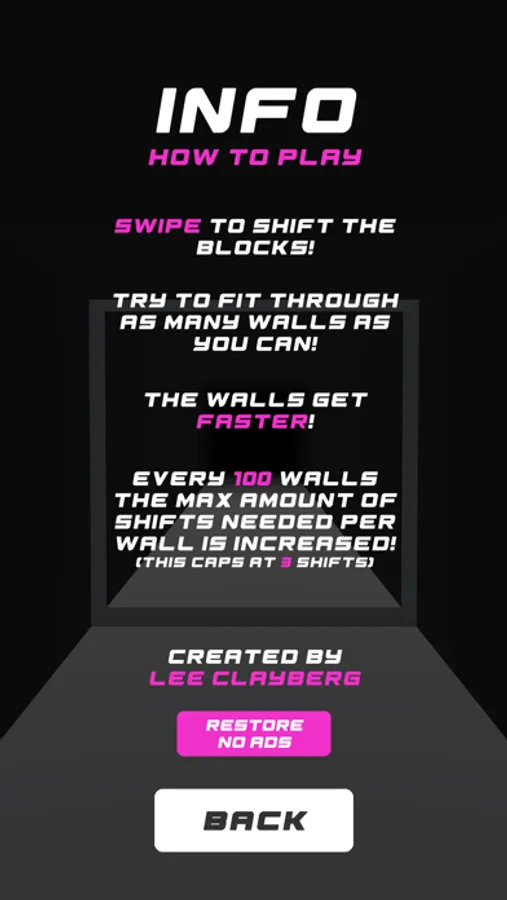 Shift the blocks around to fit through the approaching walls. The walls increase in speed and become more difficult the longer you stay alive. The diamonds collected along the way can be used in the shop to buy color options.