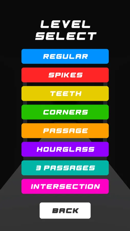 Along with the regular endless mode, there are 8 additional game modes for levels: Regular, Spikes, Teeth, Corners, Passage, Hourglass, 3 Passages, Intersection. Each game mode contains a different layout of unmovable blocks.