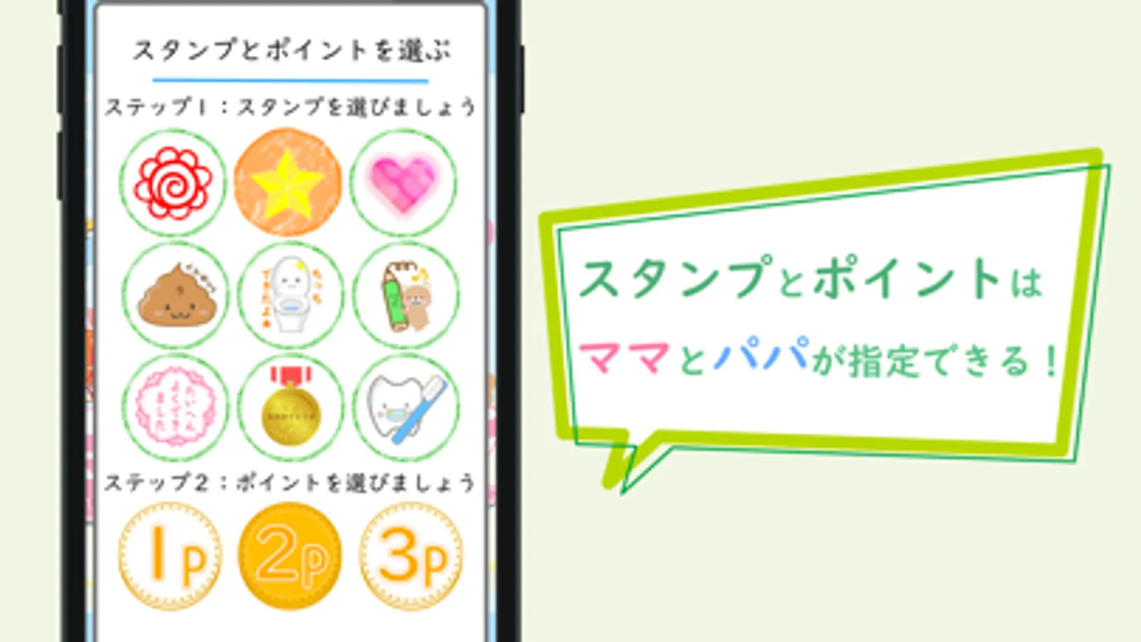 ・スタンプ種類(9種)とポイント数(1~3ポイント)はママとパパが選べます。