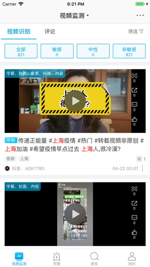 蜜度索骥是视频、图片、音频、舆情监测与分析平台。实时监测多个视频平台中海量视频舆情数据,先进的OCR、AI影像识别等流媒体处理技术,智能识别并提取视频中的字幕、音频、背景、封面等特征元素,发现视频舆情,帮助用户更好地应对全媒体时代信息传播挑战。