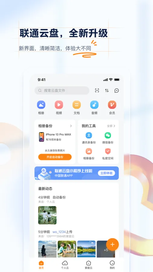 联通云盘是中国联通基于5G网络为满足用户海量数据的存储需求,面向个人及家庭用户提供的个人云、家庭云、微信/通讯录/相册备份、多端文件共享等云存储服务,旨在为用户带来更极速,更安全,更智慧的全场景融合云存储体验。