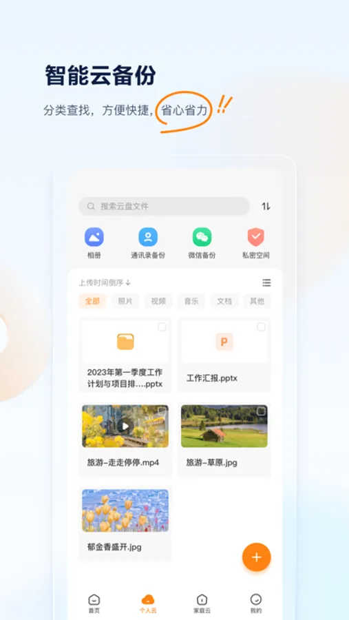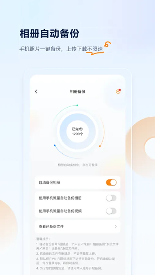 支持手机相册、视频自动备份,支持微信文件备份,支持通讯录备份;