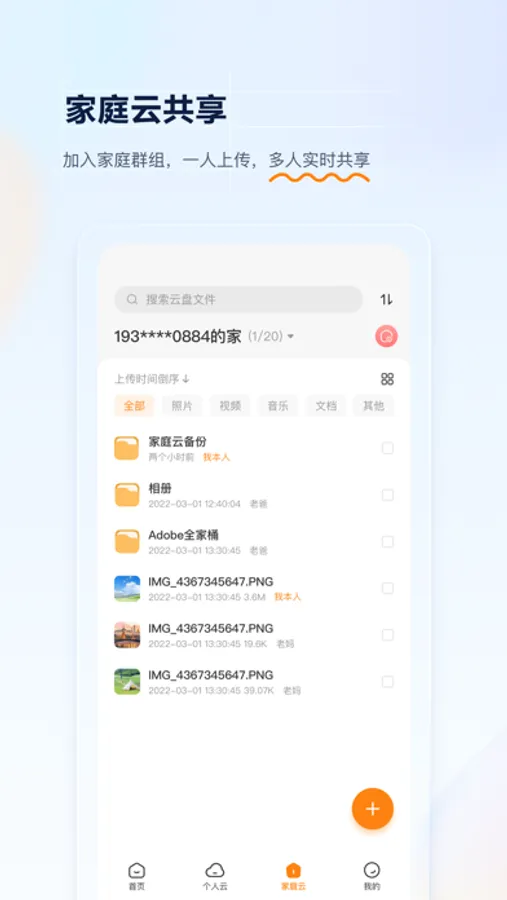 1、支持创建家庭群组,一人上传,全家共享;