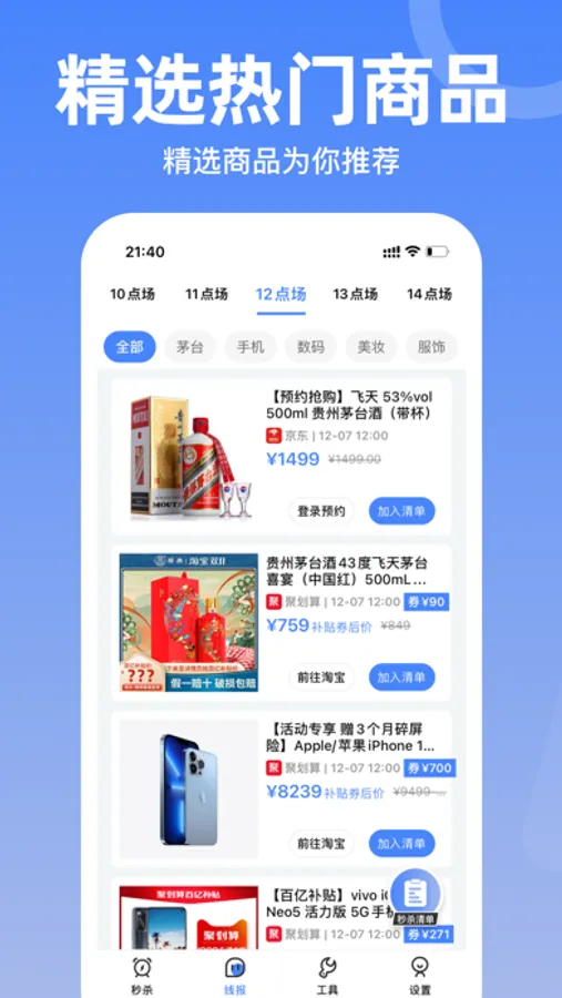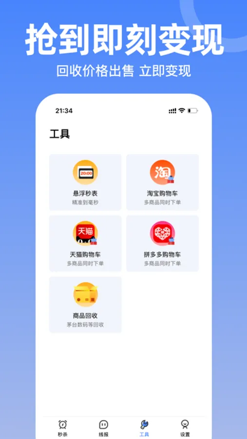 毫秒级自动跳转秒杀神器,原价抢茅台、潮鞋、美妆。让你抢的多赚的多,支持淘宝、天猫、拼多多、京东、苏宁易购、酒仙网、聚划算、淘宝特价版等主流平台