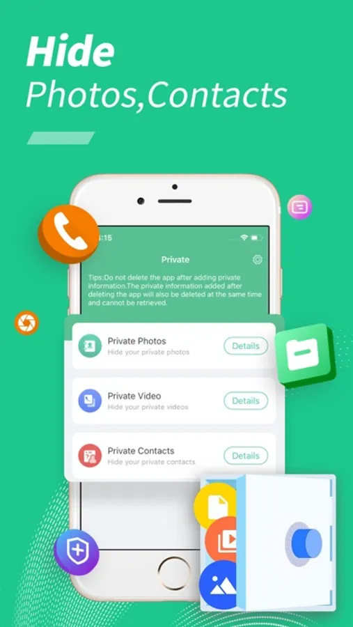 • Private function, store your private photos/videos/contacts, the password cannot be retrieved, eliminate hidden dangers, and escort your privacy.