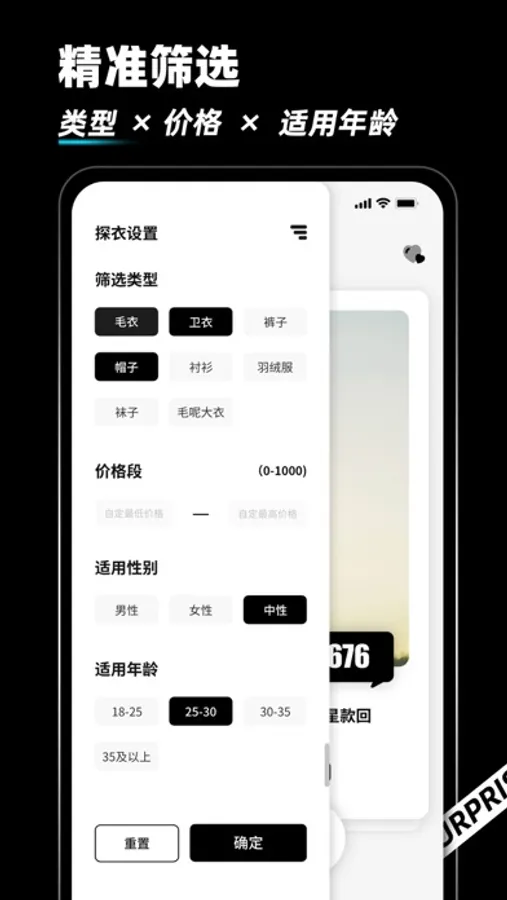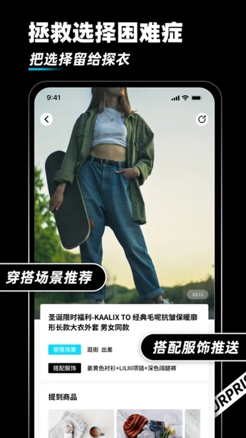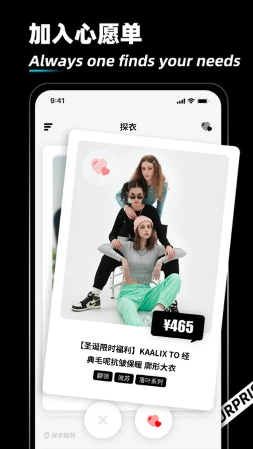 探衣 - 总有一款适合你。探衣为每一件精选的服装产品从各个维度打标签(包括风格,款式,版型,材质,颜色,价格等等),用户看到衣服展示图后左滑代表不喜欢,右滑代表喜欢。通过用户的行为数据为用户做服装实时推荐。