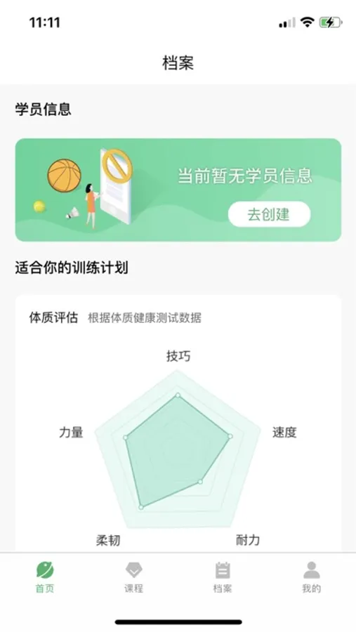 学员的技巧、速度、耐力、柔韧、力量的体质健康测试数据均会在测试训练后由教练如实记录,形成个人体质评估表,并根据该数据为你推荐适合提升的专项课程,让训练和进步“有迹可循”。