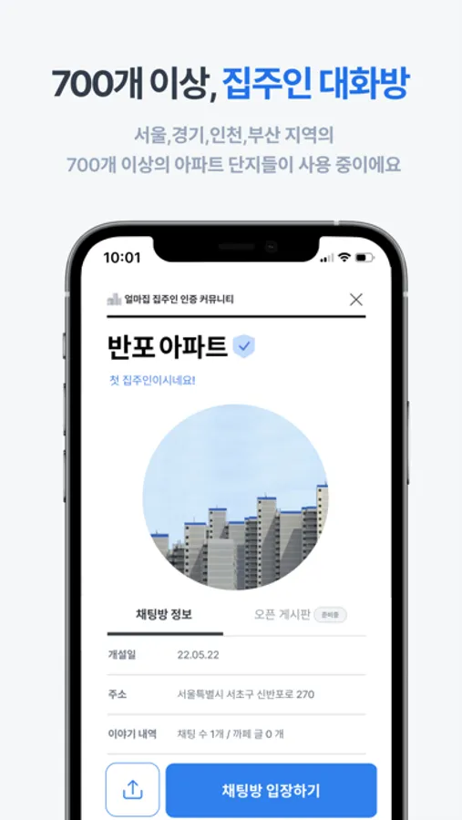 - 같은 아파트 단지 소유주끼리 대화 가능한 채팅방에 익명으로 참여