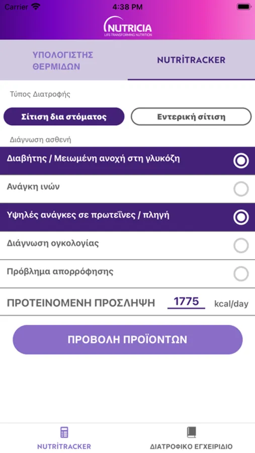 Η εφαρμογή NutriTracker έχει σχεδιαστεί για να διευκολύνει τον Επαγγελματία Υγείας να υπολογίσει τις ανάγκες των ασθενών του σε θερμίδες και πρωτεΐνη και να προτείνει την κατάλληλη διατροφική παρέμβαση με ιατρικά σκευάσματα με στόχο την αύξηση της πρόσληψης των παραπάνω.