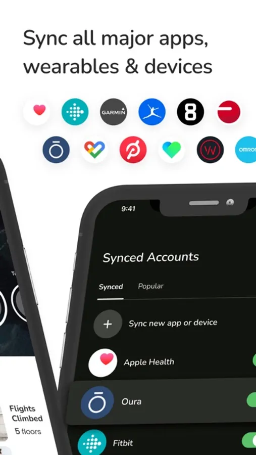 Apple Watch, Garmin, Oura, Fitbit, Google Fit, Withings, MyFitnessPal, Peloton, Polar, Omron, Eight Sleep, Aktiia, Biostrap, Bryton Sport, Cardiomood, Clue App, Concept2, Coros, Cronometer, Cycling Analytics, Decathlon, EatThisMuch, FatSecret, FinalSurge, FreeStyle Libre, Hammerhead Karoo, Health Gauge, iFit, Ketomojo, Komoot, Lezyne, LiveRowing, MacrosFirst, Moxy Monitor, Nolio, Nutracheck, Ride with GPS, Suunto, Tempo, Training Peaks, Under Armour, Wahoo Fitness, Zwift & many more!
