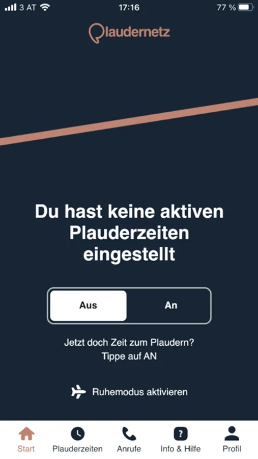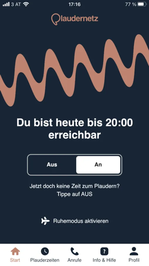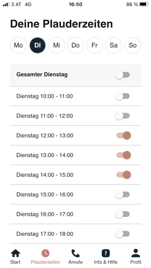 - Zeitliche Verfügbarkeit angeben: Mit der App kannst du als Plauderpartner*in eingeben, zu welchen Zeiten du für Gespräche erreichbar sein magst. Du kannst deine verfügbaren Plauderzeiten pro Wochentag und Stunde angeben und diese Angaben jederzeit ändern. Du wirst nur innerhalb deiner angegebenen Zeiten Anrufe empfangen. Falls du doch jetzt Zeit zum Plaudern hast, kannst du dich auch gleich auf "AN" setzen und sofort Anrufe entgegen nehmen.
